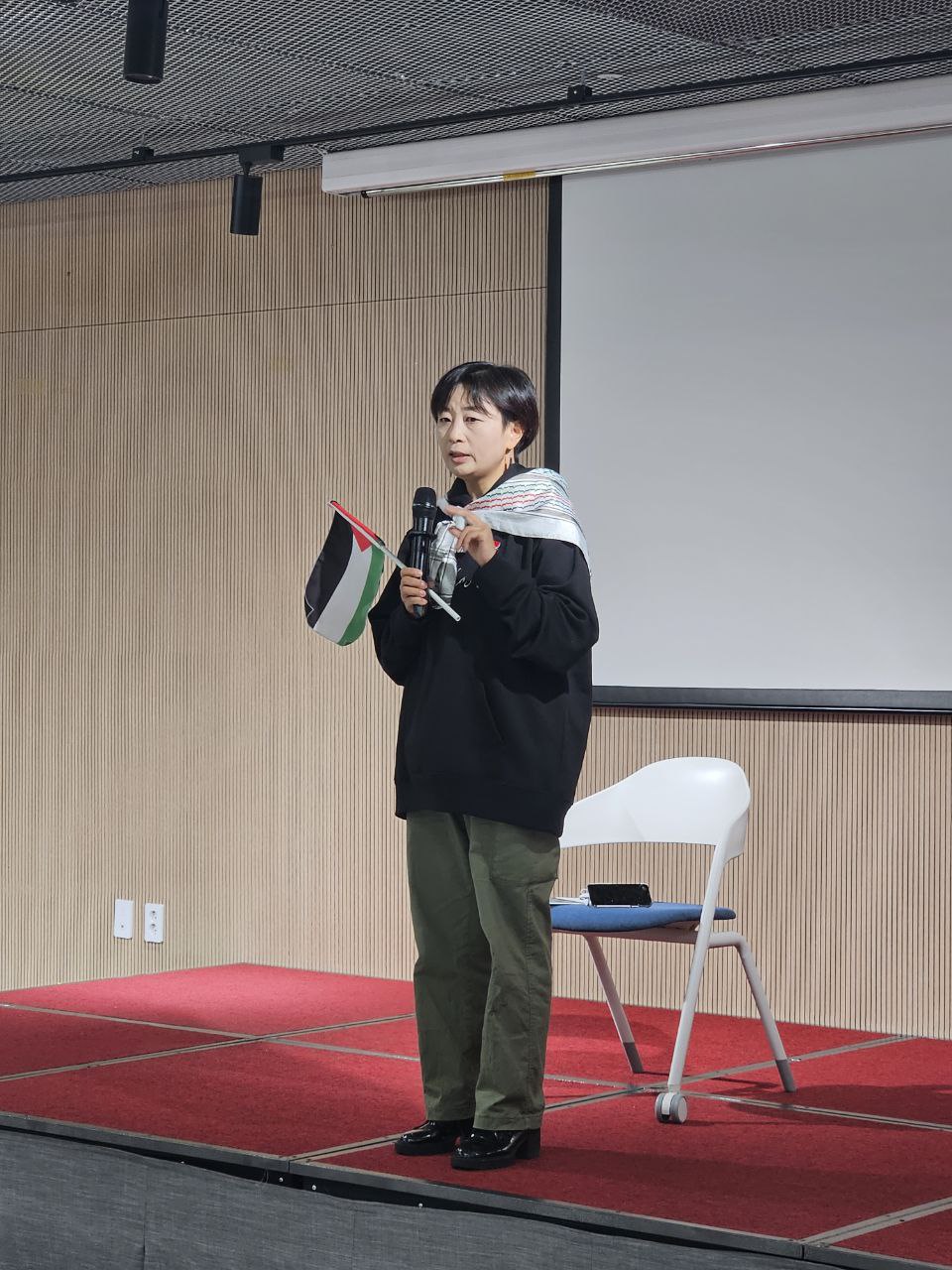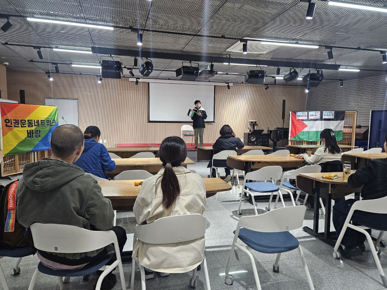 영화 상영에 앞서 명숙 활동가가 팔레스타인의 역사, 전쟁 배경, 현재 정세를 컴팩트하게 요약하여 설명했습니다.
