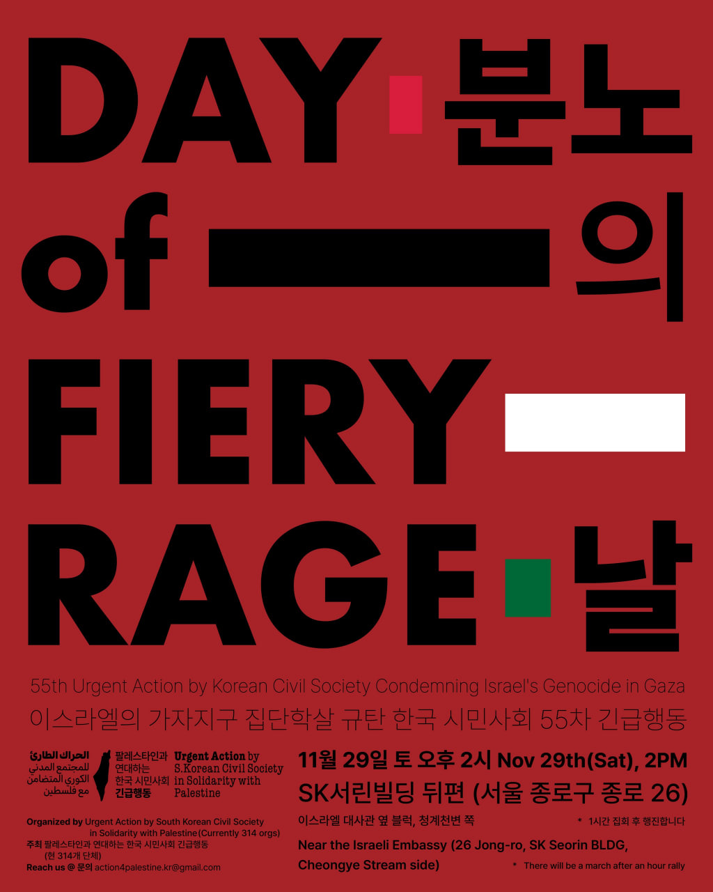 팔레스타인에서 우리를 포함해 전 세계 자유 시민에게 11월 29일에 각국의 이스라엘 대사관 앞에 집결해 이스라엘을 고립시키고 집단학살에 대한 책임을 물어 달라는 호소문을 보내 오셨습니다.