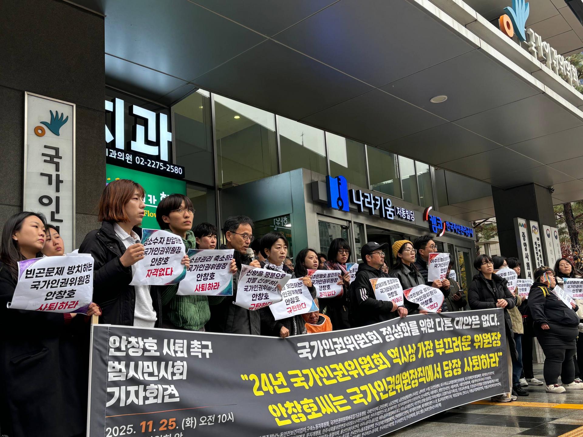 국가인권위원장 안창호씨는 취임 1년 남짓한 기간 동안 보편적 인권 기준을 부정하는 말과 행동 그리고 국가인권위원회 결정을 반복해 왔습니다. 사회적 약자들에 대한 편향된 시각은 인권위원장이 갖춰야 할 기본적 자격조차 애초에 없었음의 증명이다. 그동안 안창호씨가 반복적으로 내뱉은 수많은 반인권적 언어들은 단순 실언이 아닌, 그의 생각과 삶 속에 자리 잡은 오염된 신념이고 인권감수성의 부재이다. 국가인권위원회 내부에서도 유례를 찾아 볼 수 없는 안창호씨 사퇴의 요구가 공공연하게 이어지고 있다.