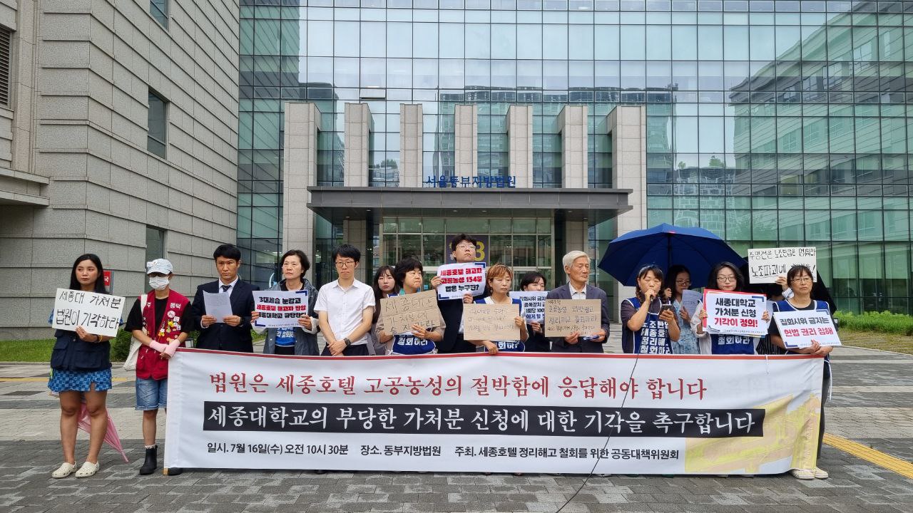 1. 오늘(7/16) 오전 세종호텔 정리해고 철회를 위한 공동대책위원회(세종호텔 공대위)는 세종대학교 측이 청구한 세종대학교 앞 집회금지 가처분 관련 재판이 열려, 재판 전에 기자회견을 하였습니다. 법원이 세종대학교의 부당한 가처분 신청을 기각해 줄 것을 촉구하였습니다. 기자회견을 마치고 1,559명의 시민들이 참여한 의견서를 재판부에 제출한 후에 재판을 방청했습니다.