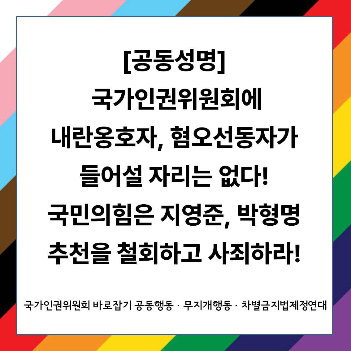 그럼에도 국민의힘은 국회 상정을 보류하였을뿐 여전히 이 사태에 책임을 지고 지영준, 박형명의 추천을 완전 철회하지 않고 있다. 국가인권위원회 바로잡기 공동행동, 무지개행동, 차별금지법제정연대는 이러한 국민의힘의 행태를 강력히 규탄하며 국가인권위원회 정상화를 위해 공당으로서 책임을 다할 것을 강력히 요구한다.