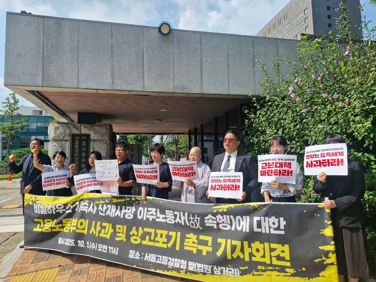 보도자료기숙사 산재사망 이주노동자(故속헹) 국가배상 판결에 대한 고용노동부의 사과 및 상고포기 촉구 전국 이주 노동 인권단체 공동기자회견