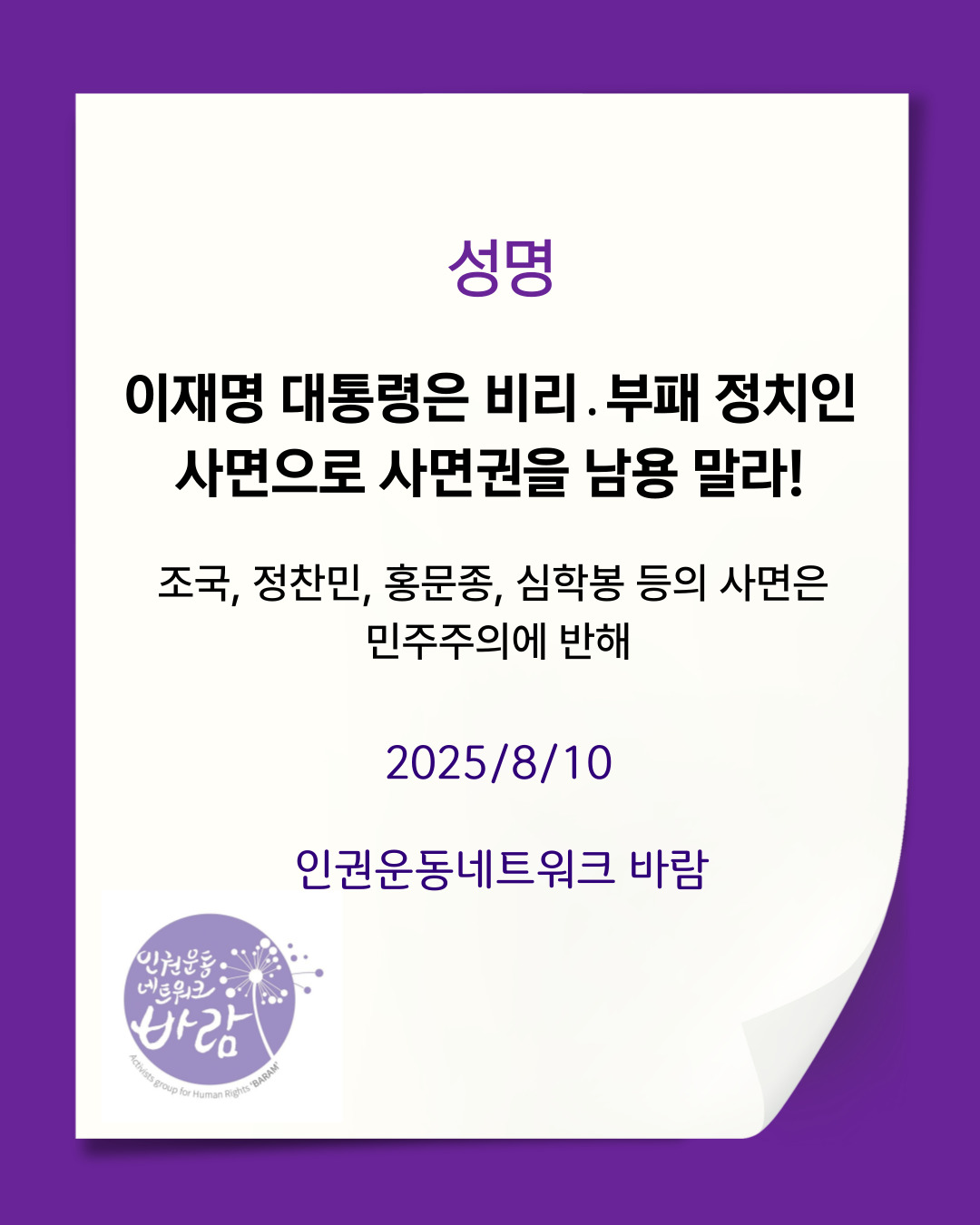 인권운동네트워크 바람은 이재명 대통령에 요구한다. 비리 부패정치인을 사면 대상에서 제외하라! 또한 사면권의 남용을 방지할 수 있도록 사면법을 개정하라!