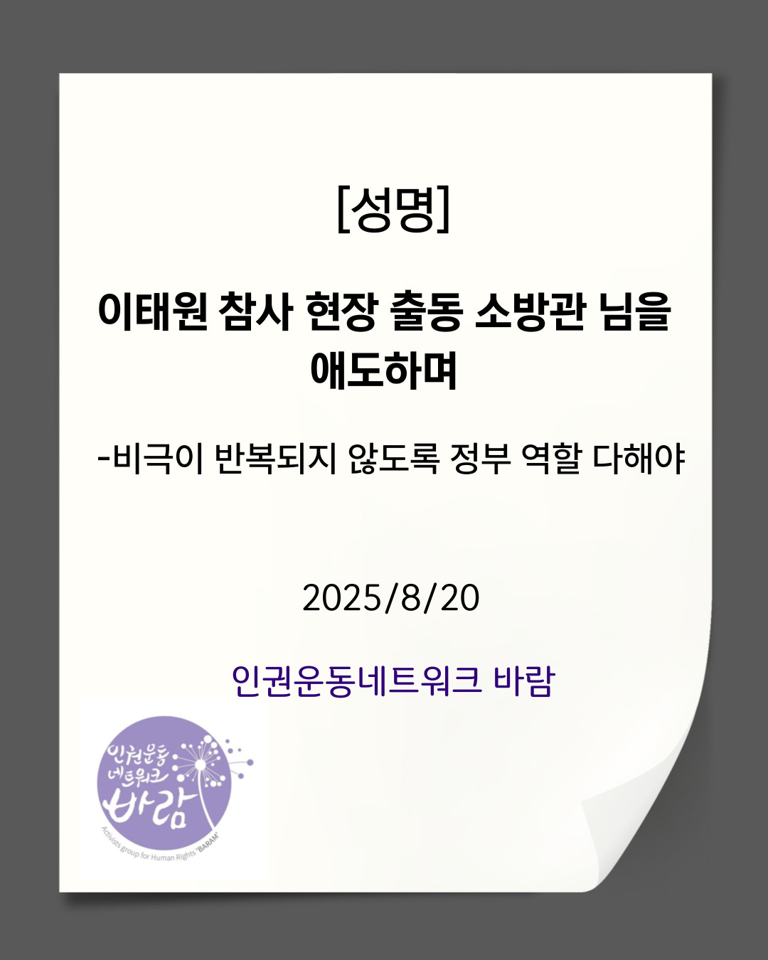 인권운동네트워크 바람은 이전 정부에서 제대로 해결하지 못한 이태원참사의 진상규명 외에도 구조자, 생존자, 지역주민들의 고통을 치유하고 일상으로 회복할 수 있도록 지속적인 지원을 할 것을 현 정부에 요구합니다. 더 이상 비극이 반복되지 않도록 인권운동네트워크 바람은 피해자 곁에 서겠습니다.