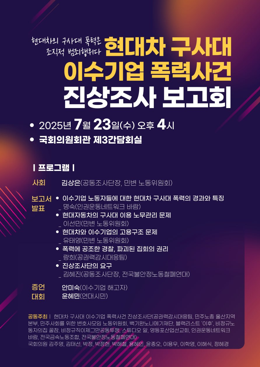 -진상보고서를 발표하는 1부에 당일 벌어진 2025년 구사대 폭력의 특징, 현대차 구사대 운영 구조와 문제점을 다루는 현대자동차의 구사대 이용 노무관리 문제 , 이번 구사대 폭력의 배경이 된 현대차와 이수기업의 고용구조 문제, 구사대 폭력의 강도가 높아진 원인이 된 폭력에 공조한 경찰, 파괴된 집회의 권리 등의 내용을 발표합니다. 이번 보고서에는 민주주의와 노동자의 권리를 침해하는 구사대 폭력을 방지할 방안에 대한 요구사항도 담았습니다. 2부에서는 폭력 피해의 당사자인 이수기업 해고자와 연대자의 생생한 증언을 듣습니다. .