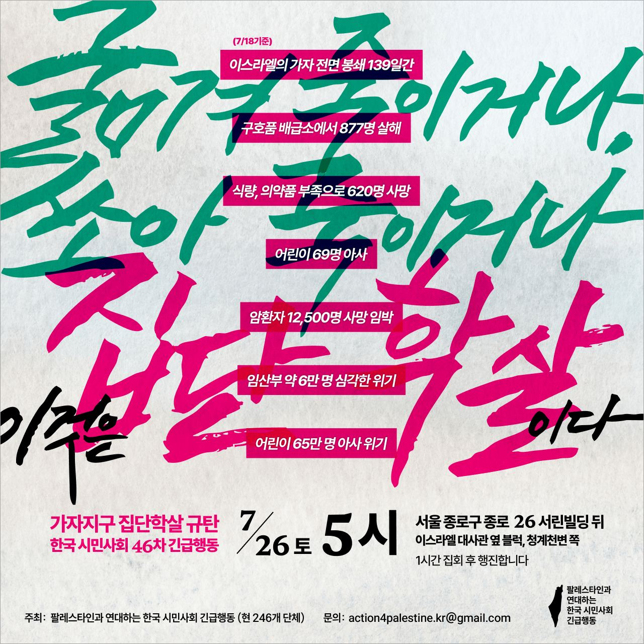 그러나 한국 정부는 그 어떤 행동도 취하고 있지 않습니다. 이에 247개 한국 시민사회단체가 함께 하고 있는 <팔레스타인과 연대하는 한국 시민사회 긴급행동>은 7월 26일(토) 17시, 청계천 SK서린빌딩 뒤편에서 “ <굶겨 죽이거나, 쏘아 죽이거나. 이것은 집단학살이다>- 이라는 제목으로 집회를 할 예정입니다. 이번에는 집회를 마치고 정리해고 철회를 외치며 고공농성하는 세종호텔 앞을 지나며 명동으로 행진할 예정입니다. 팔레스타인의 해방과 투쟁하는 노동자의 해방은 연결되어 있습니다.