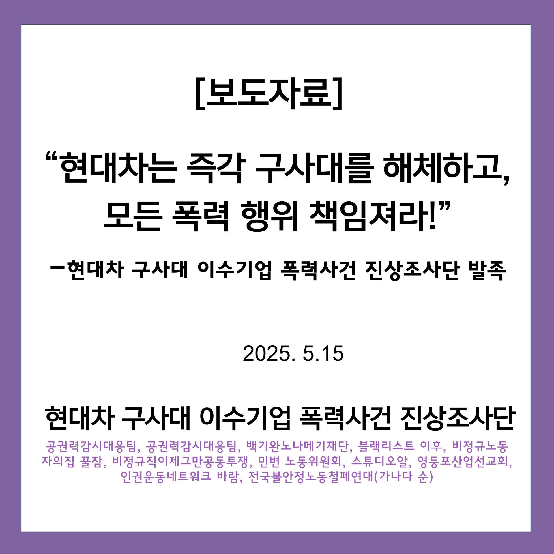 현대차는 오랜 노무관리수단이었던 구사대(회사를 구하기 위하여 모인 집단이란 뜻으로 노조 활동을 막기 위해 사용되는 직원이나 경비용역 등을 일컫는 말)를 부활시켜서 이수기업 해고노동자들의 평화로운 집회에서 연이어 폭력을 행사하게 하였습니다. 제 시민사회단체, 인권단체 등은 2025. 4. 28. 현대차 양재동 본사 앞에서 ‘현대차 구사대 비정규직 폭력만행 규탄 시민사회 기자회견’을 하여 이에 대한 공론화를 하였습니다. 나아가 보다 심층적인 실태 조사, 재발방지대책 마련을 위하여, 다수의 단체가 참여하여 ‘현대차 구사대 이수기업 폭력사건 진상조사단’을 발족하게 되었습니다.
